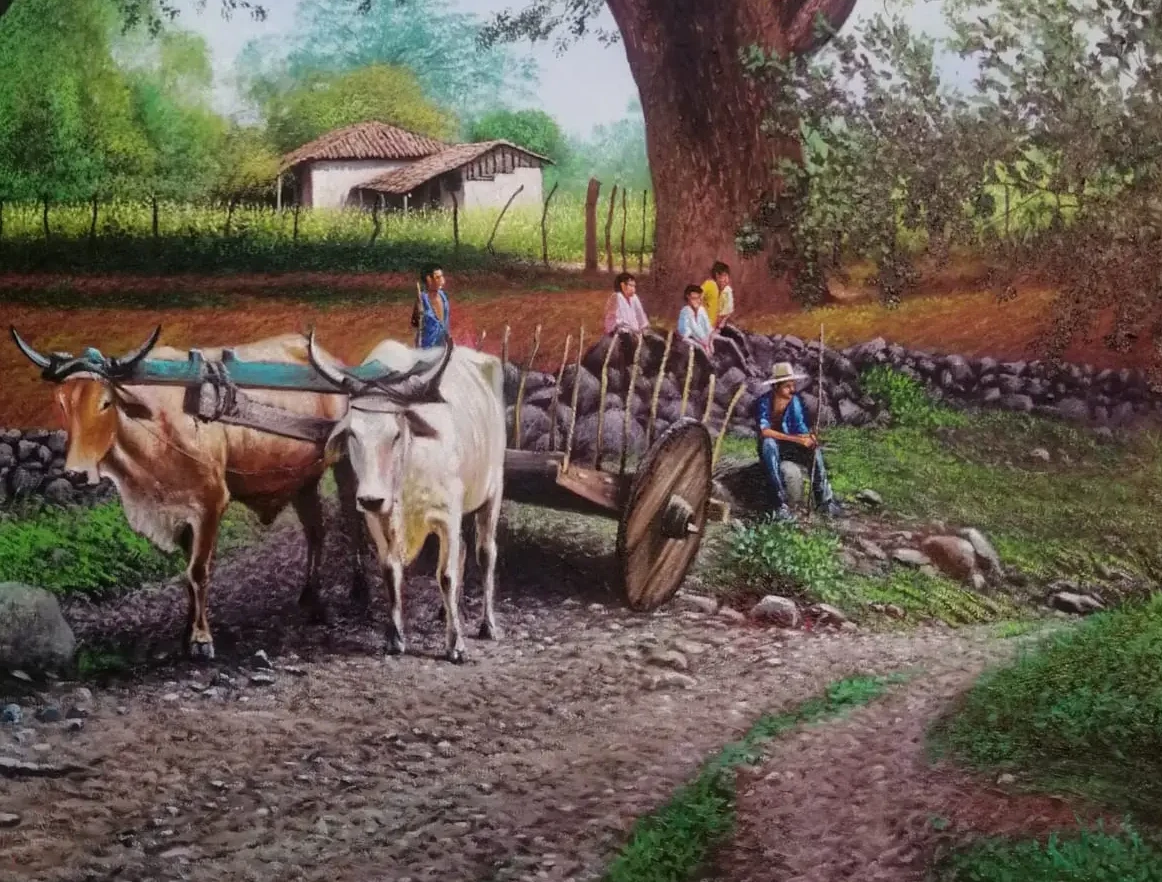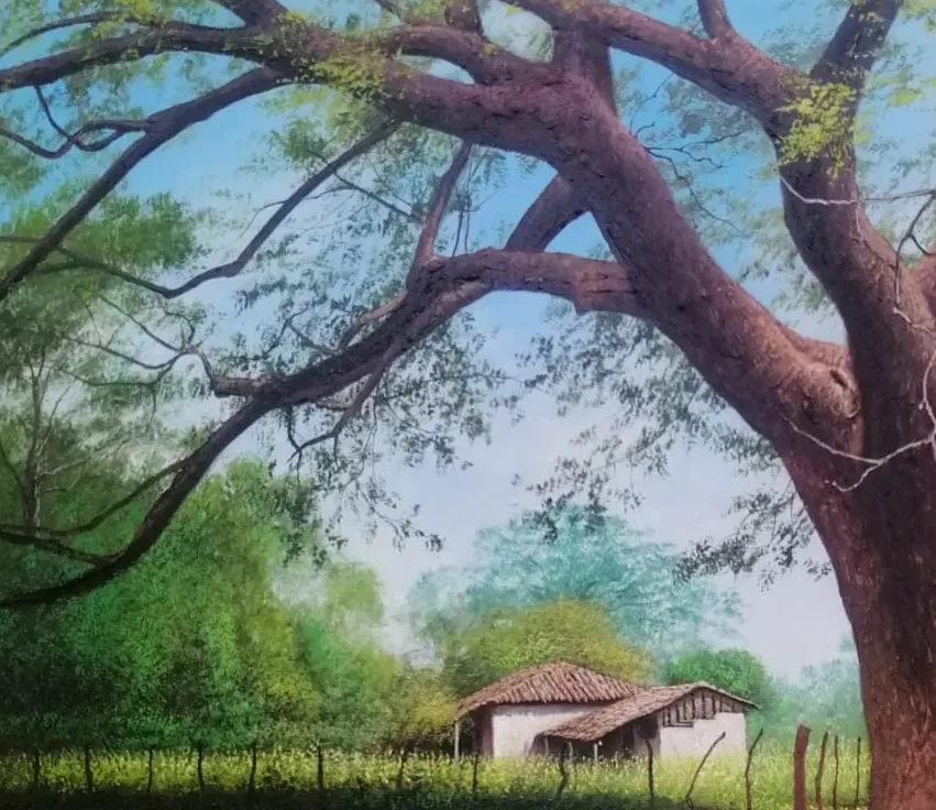 Un retrato nostálgico de la vida rural, donde la calma del campo y el esfuerzo cotidiano se funden bajo la sombra de un majestuoso árbol ancestral.